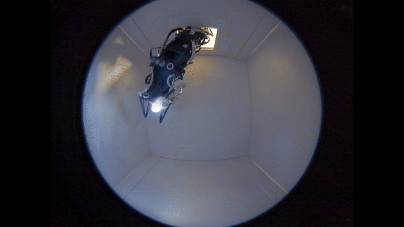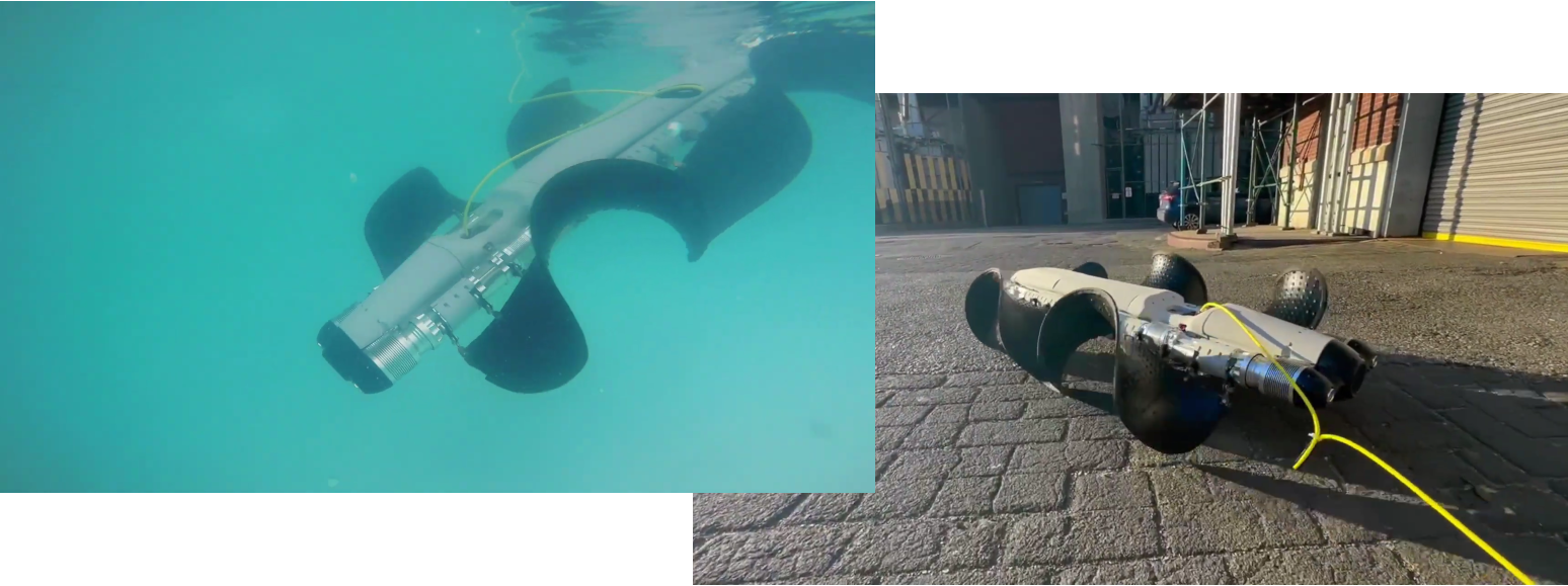 A Brooklyn-based startup Pliant Energy Systems created a beautiful amphibious robot that propels forward only using a pair of fins. It’s capable of both crawling on the floor and swimming underwater. The fins give it really good maneuverability in all directions and instantaneous way of changing directions.