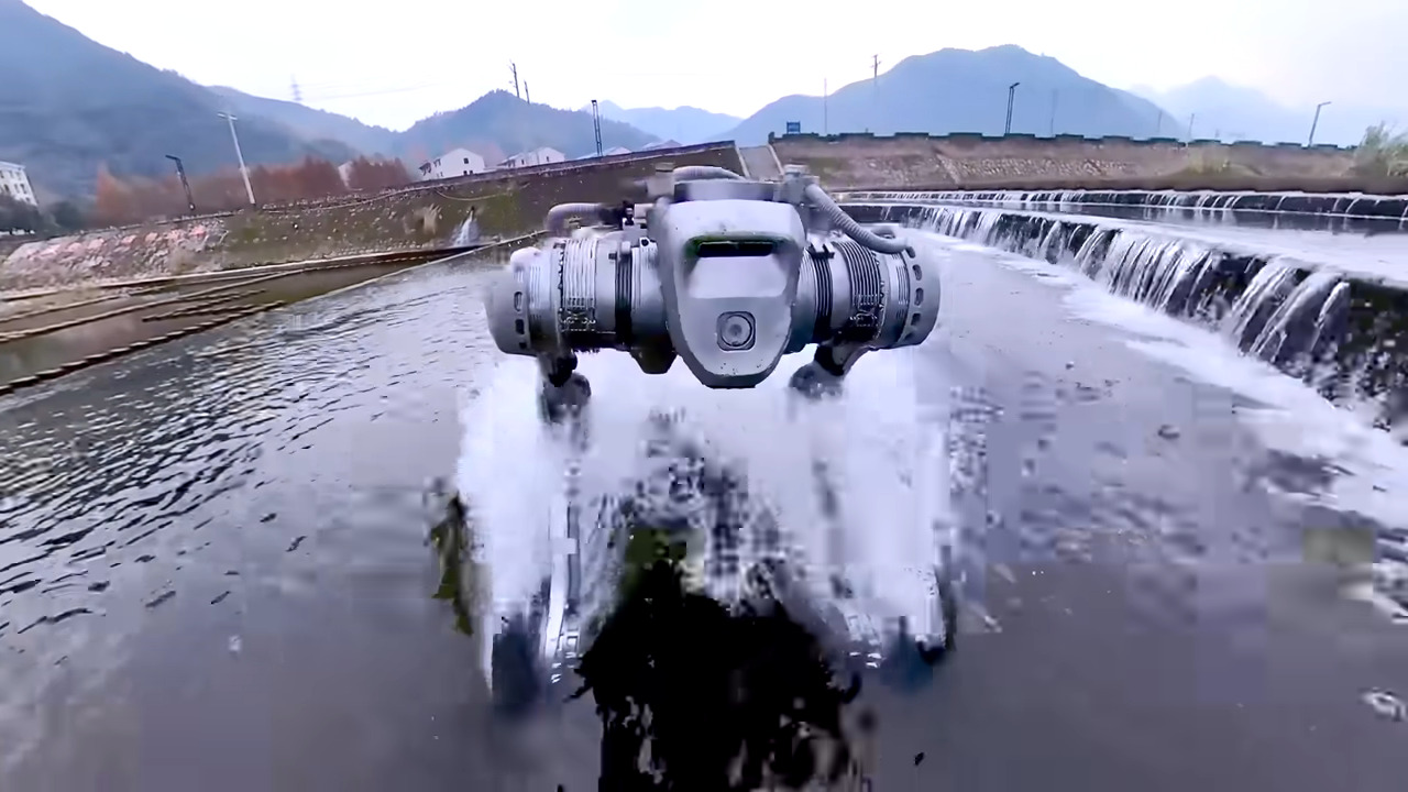 Unitree B2-W dog wheeling it down in the water at high velocity. I come back to this video every once in a while to admire how far ahead China is.