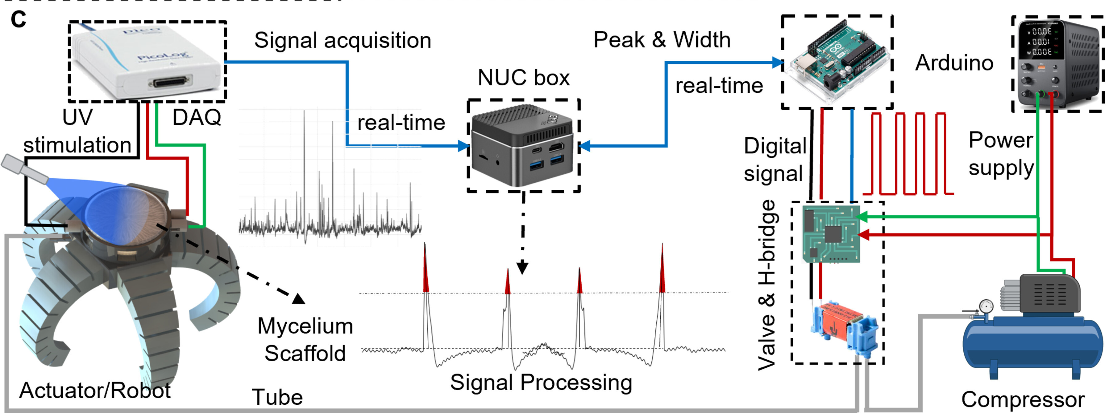 The robot control pipeline. Electrical signals recorded from the mycelium are cleaned up and converted into PWM signals that switch a solenoid valve, modulating air pressure in the robot’s pneumatic soft actuators.