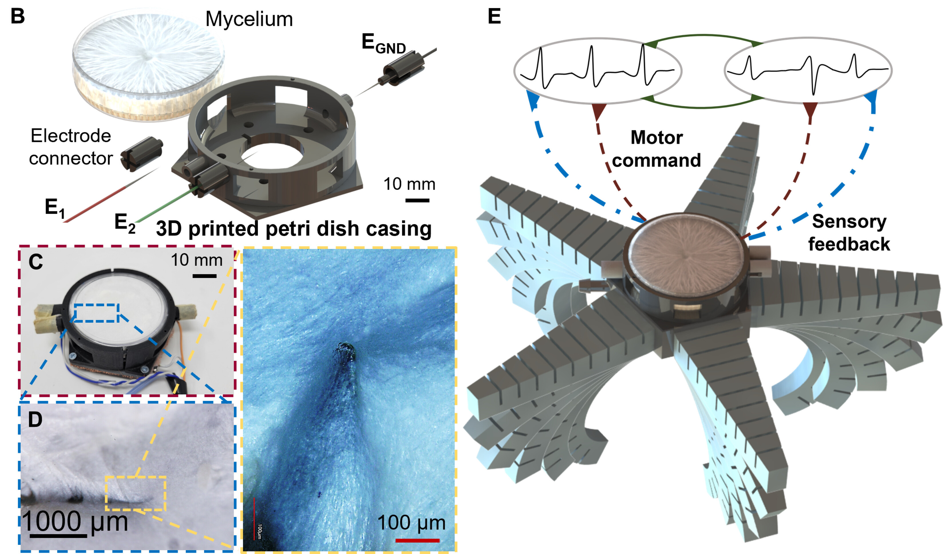 Figure from the paper showing the mycelium along its petri dish/electrodes and the 3D printed soft robot body.