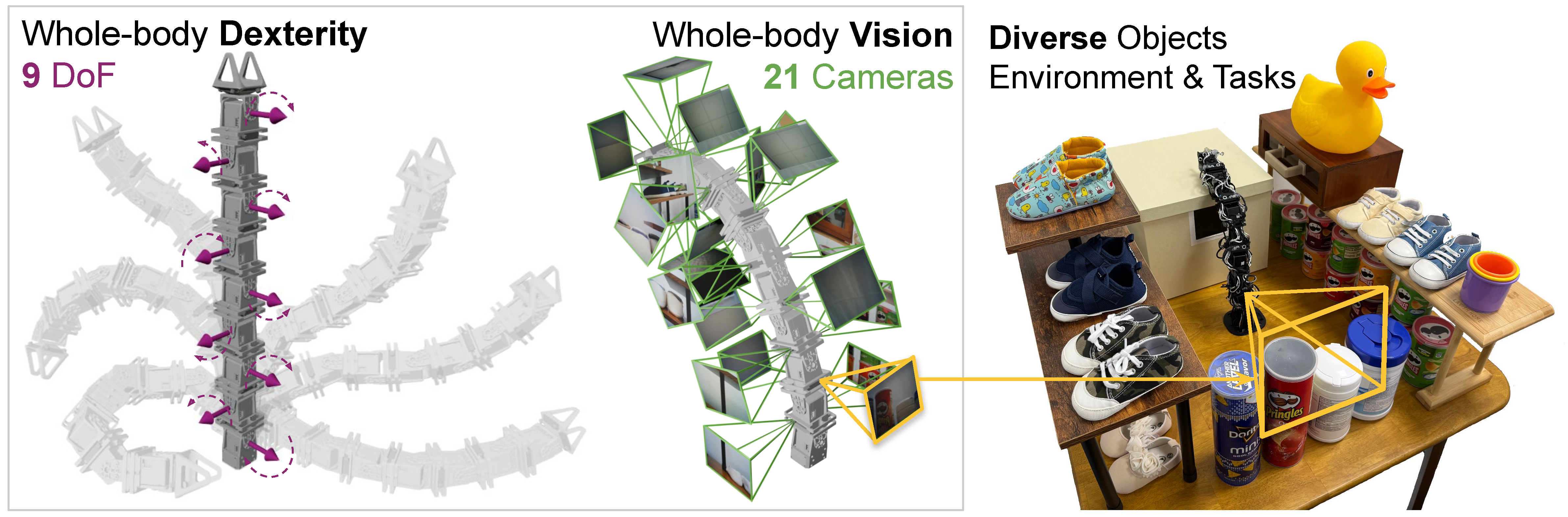 RoboPanoptes overview: 9 DoF body and 21 cameras.