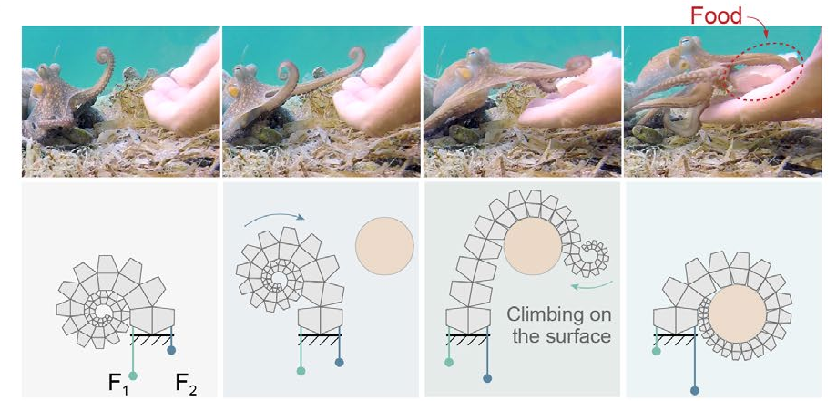 The upper figure shows how an octopus reaches for its food by curling and uncurling its arm. The spirobs arm mimics this by using 2 motors and applying force on each cable in a specific sequence.