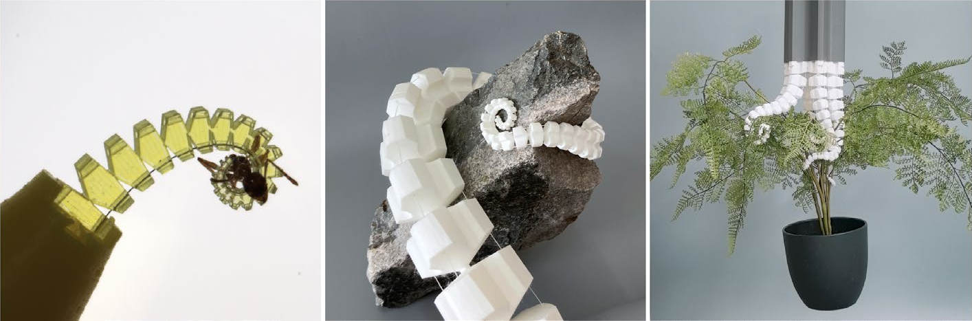 Each arm starts as a spiral with mirrored sections and spacing between each unit to allow unencumbered curling and uncurling. All parts were 3D printed and connected with an elastic band and a couple of cables connected to a pair of motors. The motors apply antagonistic force and drive the movement of the arm.