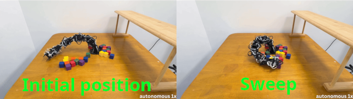 Example of whole-body dexterity: autonomously clearing 10 cubes in one sweep.