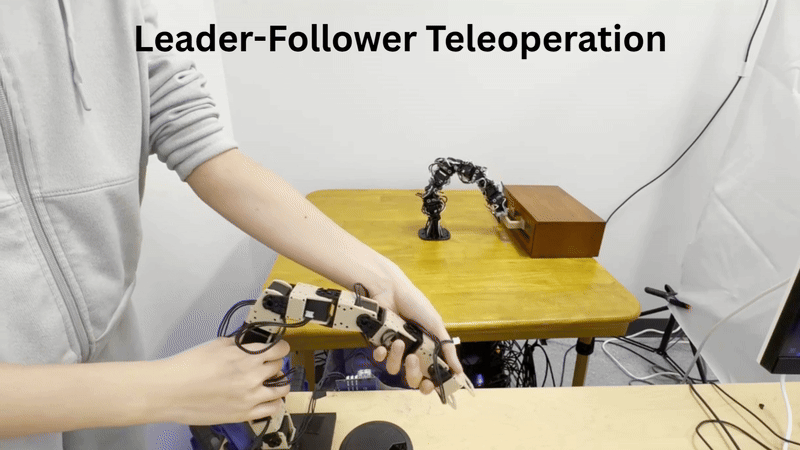 Teleoperation of the robot is done by manually manipulating a leader arm.
